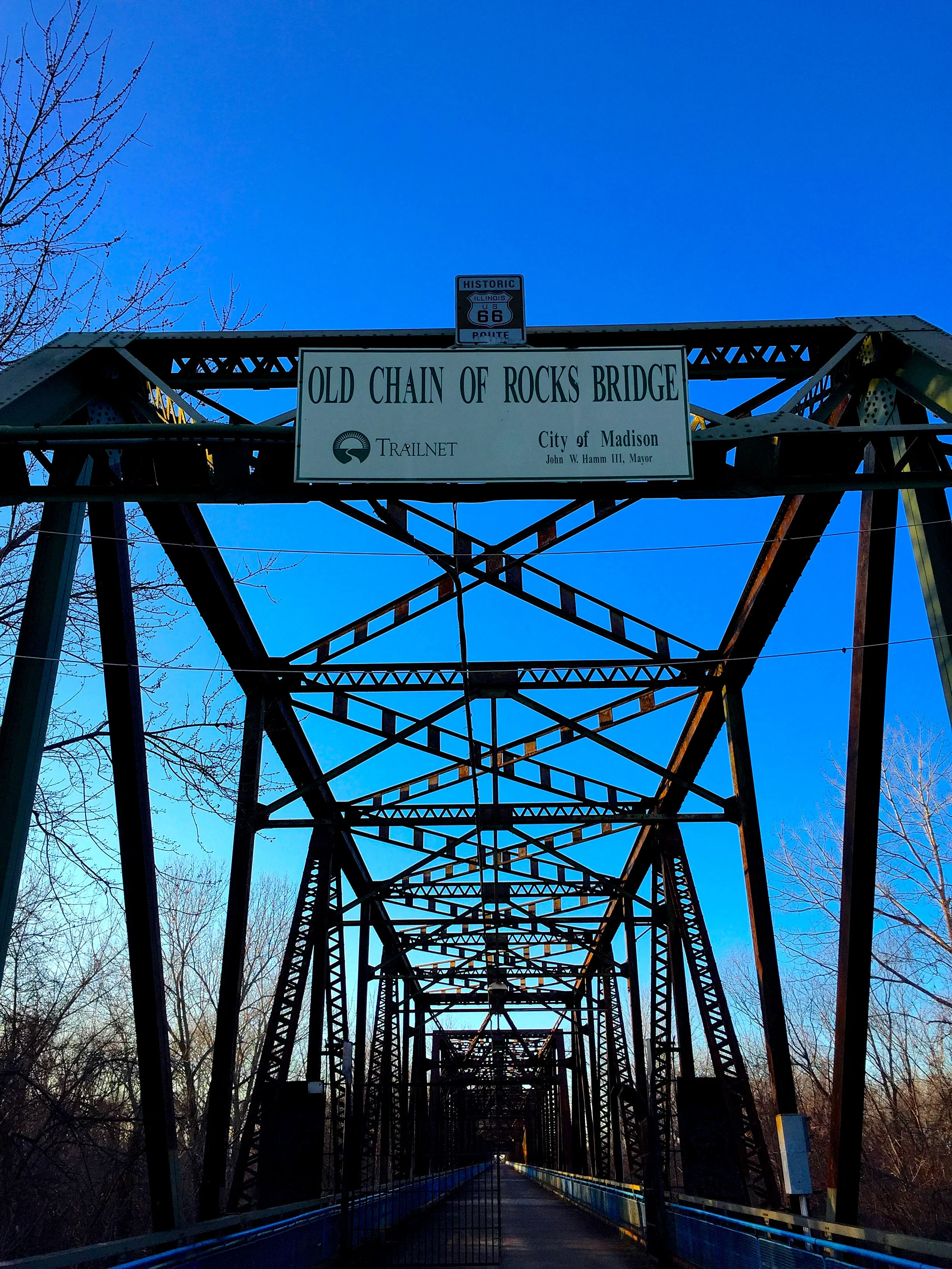 The feeling that someone from the other side might “run the red light” and drive on the bridge at the same time as you, HEAD ON, can be a bit much to handle! Especially when the bridge goes from a concrete structure to a metal frame. Not to mention it’s approaching dusk. But once you make it across that “long, stretch,” you’ll feel as if you can conquer anything in this world. Including driving across the country on Route 66! #OldChainOfRocksBridge